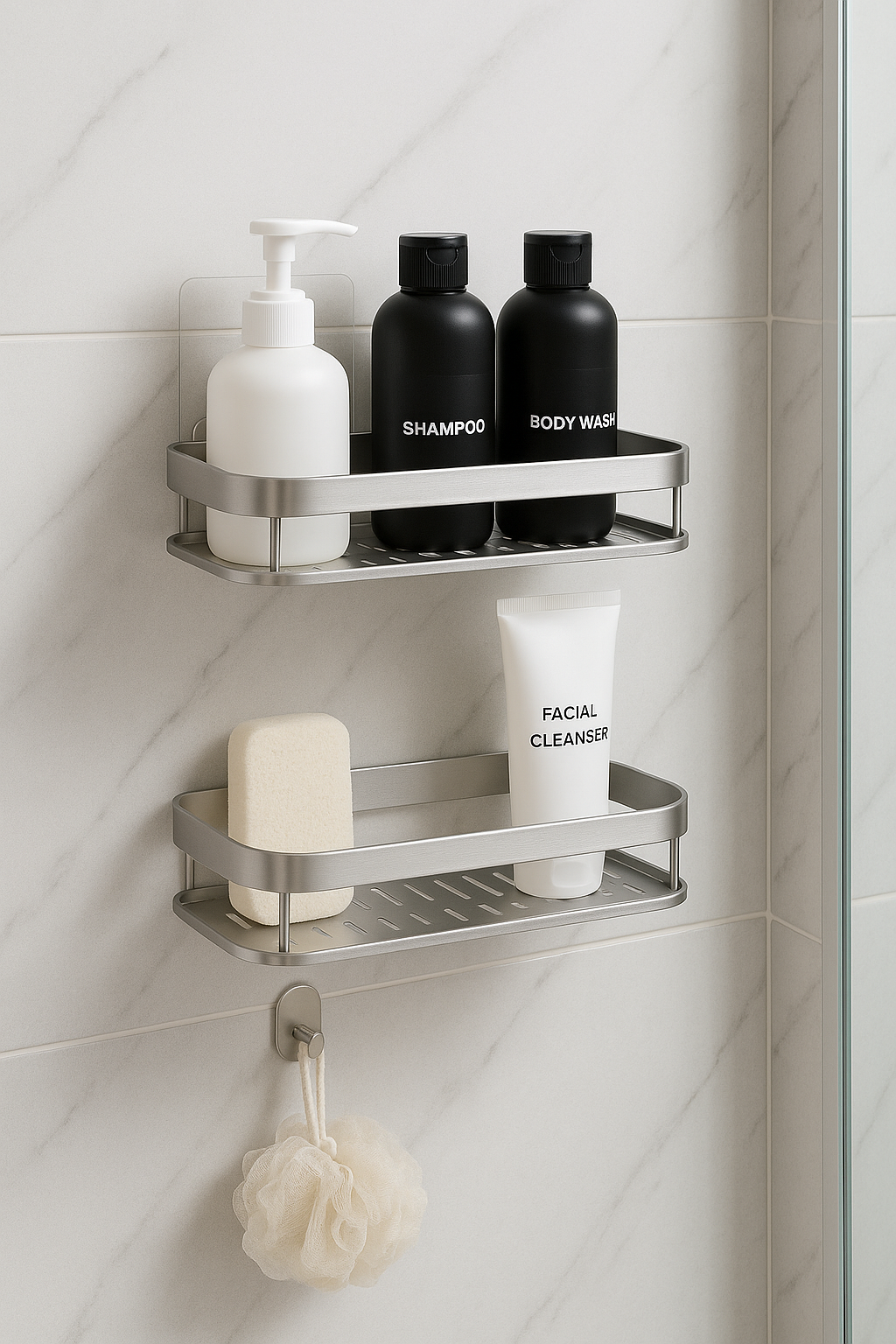 양면 테이프나 진공 흡착 방식인데, 무게도 꽤 잘 견뎌요. 특히 샴푸나 바디워시 올려놓는 2단 코너 선반 추천드립니다.